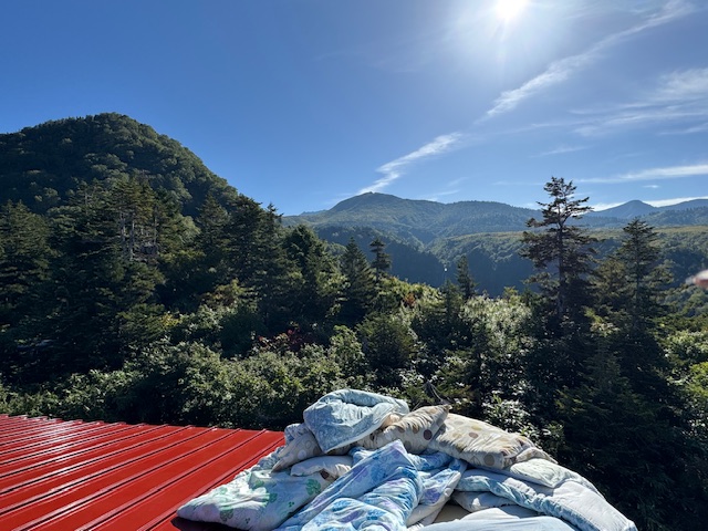 除菌スプレーをしたあと、曇りでも、屋根が乾き、太陽がうっすらでも見えたら布団を干して除菌してます。今日は掃除中、約2時間、屋根に干すことができたので、ほんわか暖かくなってました。そしてお客さんが宿泊する分、空がいいなら、また干して、大日平山荘のおもてなし布団にしてますよ。