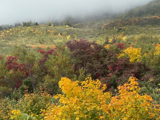 自分が見た大日平の紅葉の中で、約30年の中でも1番?2番?という綺麗さです。確かに青空があったらいいけど、今年の紅葉のできは視界さえあれば大満足する綺麗さです。自分の紅葉のオススメ場所は、、、二つ目の沢から5分〜10分登った所です。大日岳の尾根と中大日岳の尾根のちょうど真ん中で、そこは弥陀ヶ原の紅葉も見渡せる場所。深い称名峡谷の谷間もわかり、奥には青い山の薬師。また鍬崎山が見えて、、、目の視線を遠くを見ると、2つの尾根の紅葉が視界の端っこでチカチカするという場所です、、、あおるわけでもありませんが、今年の紅葉はめちゃめちゃいいです。昨日のお客さんの1組は大日岳のピストンで、今、到着し、話しをしましたら、上の紅葉も最高と言ってました。来て良かったと感動して帰られました。富山県内の方、日帰りでも大満足だと思います。