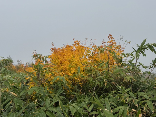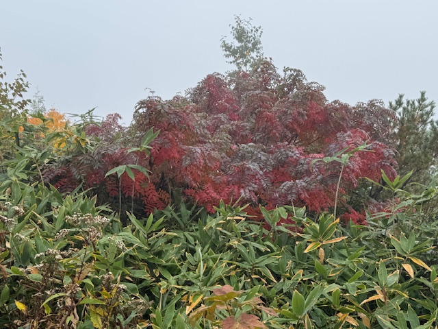 朝から、掃除、お湯、お茶の準備をしながら、外仕事の様子を見ていたのですが、、、しっかりした霧雨。木道も濡れ、屋根も濡れて、、、めげる空です。今日は視界も悪く、山も見えないので、小屋前のナナカマドとカエデの写真を撮ってきました。